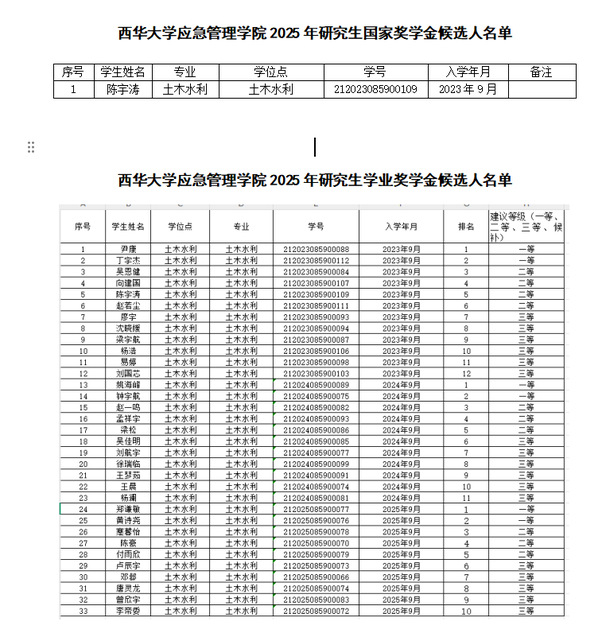 西华大学应急管理学院2025年研究生国家奖学金、学业奖学金获得者候选人名单公示