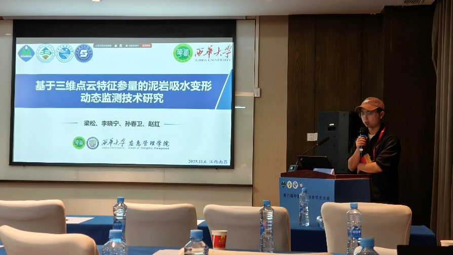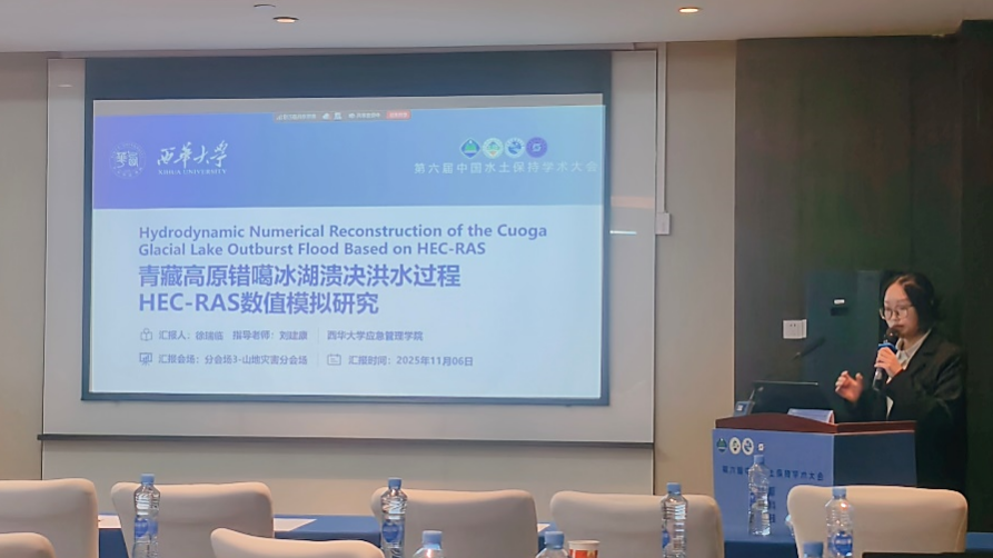 刘建康作为中国水土保持学会滑坡泥石流防治专业委员会委员参加专委会年度工作会议,并主持“山地灾害”分会场的专题汇报。徐瑞临在分会场上作了题为《青藏高原错噶冰湖溃决洪水过程HEC-RAS数值模拟研究》的报告,结合多源数据分析冰湖溃决形成机制,并采用数值模拟手段对错噶冰湖溃决过程进行重构与验证;梁松作了题为《基于三维点云特征参量的泥岩吸水变形动态监测技术》的报告,介绍了团队研发的半球视场三维动态监测系统,并展示了基于时序三维点云特征参量的泥岩变形分析方法与结果。