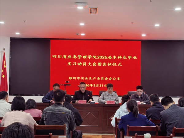 3月31日上午10:30,我院2026届本科生毕业实习动员大会暨出征仪式在彭州市湔江大厦4楼应急管理局4205会议室举行。本次会议由彭州市安全生产委员会办公室主办,我院相关负责人、彭州市13个相关职能部门、产业功能区及街道负责同志,以及我院应急管理、应急技术与管理专业30名2026届本科实习生参加会议。
