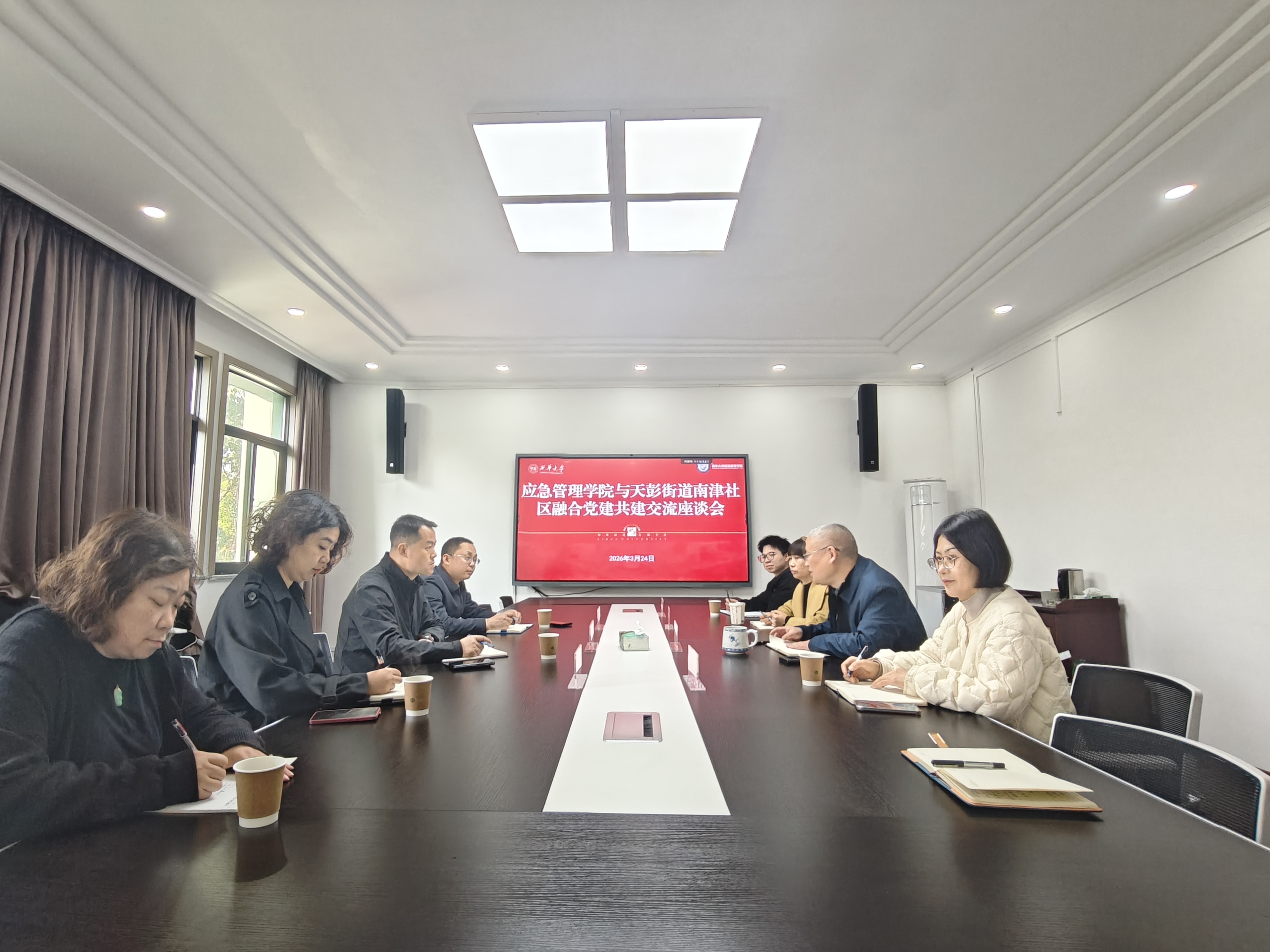 为深入推进党建与业务深度融合,切实发挥党建引领作用,3 月 24 日,西华大学应急管理学院党委与彭州市天彭街道党工委在彭州校区办公楼3-2会议室召开党建共建交流座谈会。双方紧扣 “党建引领应急管理事业发展” 核心主题,围绕党建共建具体举措展开深入研讨,共商合作大计,共绘发展蓝图。